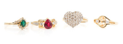 consisting of a ring containing one oval shaped golden topaz measuring approximately 7.10 x 5.13 x 3.28 mm and two round brilliant cut diamonds weighing approximately 0.05 carat total, a ring containing a pear shaped ruby measuring approximately 7.41 x 6.36 x 4.26 mm and two round brilliant and two single cut diamonds weighing approximately 0.07 carat total, a ring containing one oval shaped emerald measuring approximately 5.23 x 4.17 x 3.15 mm and 14 round brilliant cut diamonds weighing approximately 0.21 carat total, together with a 14 karat yellow gold heart motif ring containing 42 round brilliant cut colored diamonds (origin not tested) weighing approximately 0.96 carat total.