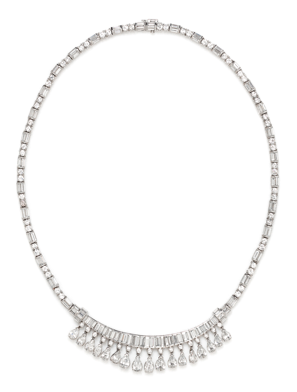 consisting of a line necklace suspending an articulated fringe in the front, the necklace containing 17 pear shape diamonds weighing approximately 5.31 carats total, 108 baguette cut diamonds weighing approximately 14.37 carats total, and 73 round brilliant cut diamonds weighing approximately 4.43 carats total.