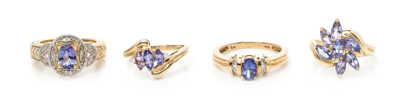 consisting of a ring containing seven marquise cut tanzanite measuring approximately 5.67 x 3.03 mm, a ring containing three marquise cut tanzanite measuring approximately 4.90 x 2.65 mm and two round brilliant cut diamonds weighing approximately 0.04 carat total, a ring containing one oval shaped tanzanite measuring approximately 6.49 x 4.57 x 3.36 mm and six princess cut diamonds weighing approximately 0.12 carat total together with a ring containing one oval mixed cut tanzanite measuring approximately 6.81 x 4.88 mm and numerous round single cut diamonds. Stamp: 14k (maker's mark).Stamp: STS 14K INDIA.Stamp: TJC 14K.Stamp: STS 14K.