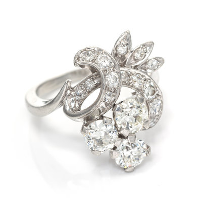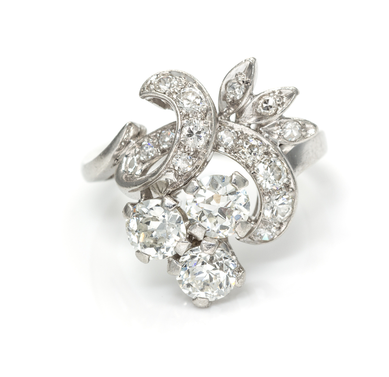 containing three old European cut diamonds weighing approximately 1.47 carats total, and 13 old European and single cut diamonds weighing approximately 0.40 carat total. Stamp: PLAT.