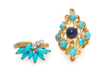 consisting of one ring containing eight marquise shape cabochon cut simulated turquoise measuring approximately 6.52 x 3.80 mm and three round brilliant cut diamonds weighing approximately 0.15 carat total, together with an 18 karat gold ring with eight round cabochon cut turquoise measuring approximately 4.50 mm in diameter and one round cabochon cut lapis lazuli measuring approximately 7.80 mm in diameter. Ring stamp: 750; 434B.