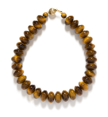 consisting of 32 tiger's eye beads measuring approximately 20.04 x 11.17 mm, and two round tiger's eye beads measuring approximately 10.15 mm in diameter strung with a gold tone clasp.