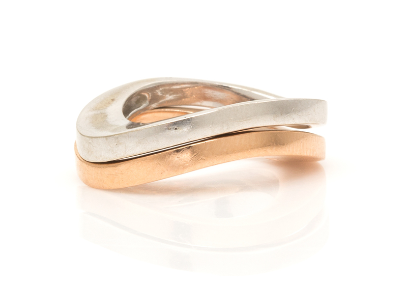 consisting of a rose gold and a white gold band with a wave design.Stamp: 14K.