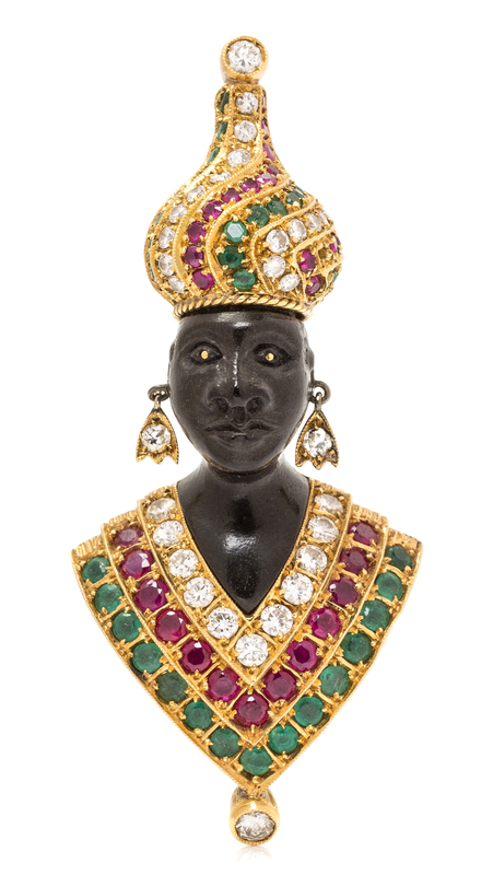 An 18 Karat Yellow Gold, Ebony, Diamond and Multigem Blackamoor Brooch, Nardi,