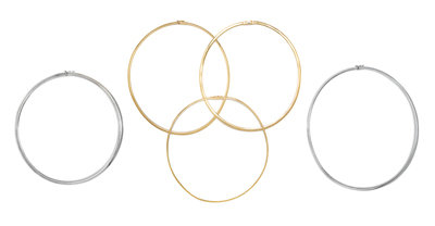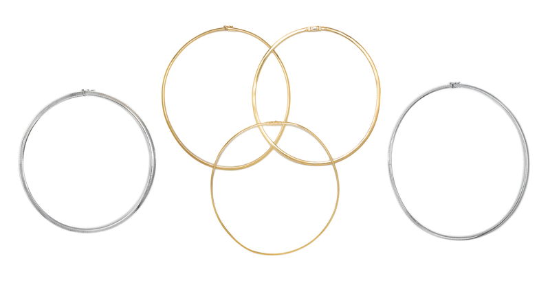 consisting of an 18 karat yellow gold omega measuring approximately 3.00 mm wide, a 14 karat white gold omega measuring approximately 5.00 mm wide, a 14 karat white gold omega measuring approximately 4.00 mm wide, an 18 karat white and yellow gold reversible omega necklace measuring approximately 3.00 mm wide, together with a white and yellow gold reversible omega necklace measuring approximately 4.00 mm wide.