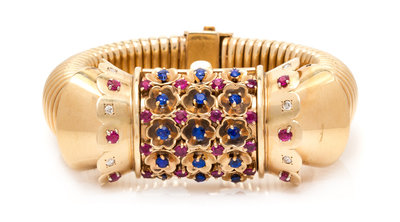 A Retro Rose Gold, Ruby, Sapphire and Diamond Surprise Wristwatch, John Rubel for Cartier,