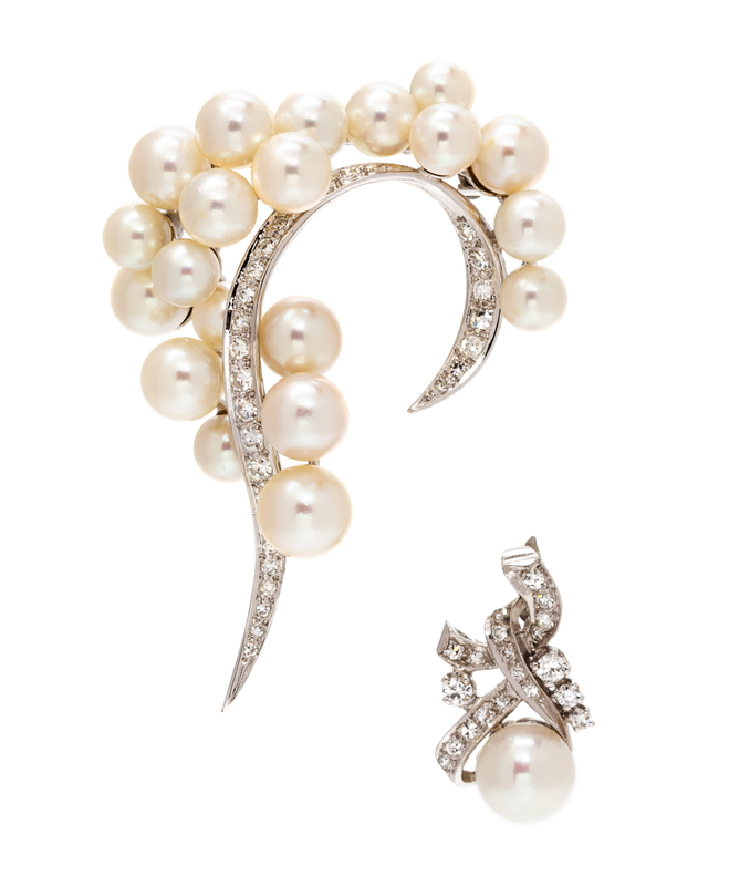 consisting of a 14 karat white gold brooch containing 20 pearls measuring approximately 5.40-7.70 mm in diameter and 25 round single cut diamonds weighing approximately 0.63 carat total, together with a white gold pendant containing one pearl measuring approximately 8.25 mm in diameter and 20 round brilliant and single cut diamonds weighing approximately 0.40 carat total. Brooch stamp: 14K.