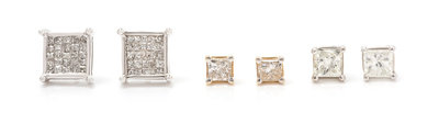 consisting of a pair of yellow gold studs containing two princess cut diamonds weighing approximately 0.45 carat total, a pair of white gold studs containing 50 princess cut diamonds weighing approximately 0.65 carat total, together with a pair of white gold studs containing two princess cut diamonds weighing approximately 0.80 carat total.