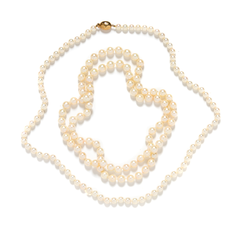 consisting of a single strand necklace containing numerous pearls measuring approximately 8.10-8.40 mm in diameter strung knotted in an endless style, together with a single strand necklace containing numerous pearls measuring approximately 6.50-6.70 mm in diameter strung knotted with an 18 karat yellow gold clasp.