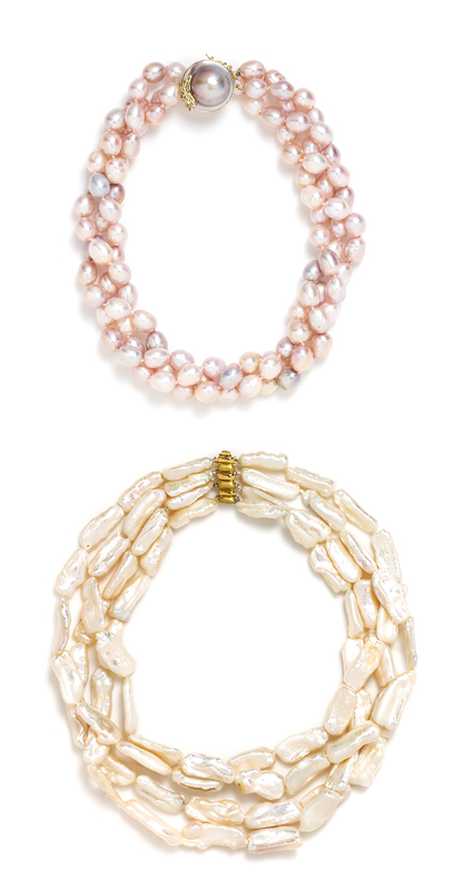 consisting of a triple strand necklace containing numerous pink pearls measuring approximately 10.75 x 8.84 mm strung knotted with a yellow gold clasp containing one pink mabe pearl, together with a four strand necklace containing numerous keishi pearls measuring approximately 22.64 x 9.90 mm strung knotted with a yellow gold clasp.Stamp: 14K.Stamp: 585.