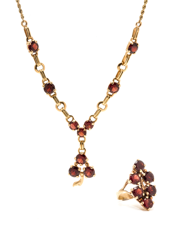 consisting of a ring containing six round mixed cut garnets measuring approximately 6.05 mm in diameter together with a necklace containing 10 round mixed cut garnets measuring approximately 5.01-6.00 mm in diameter.