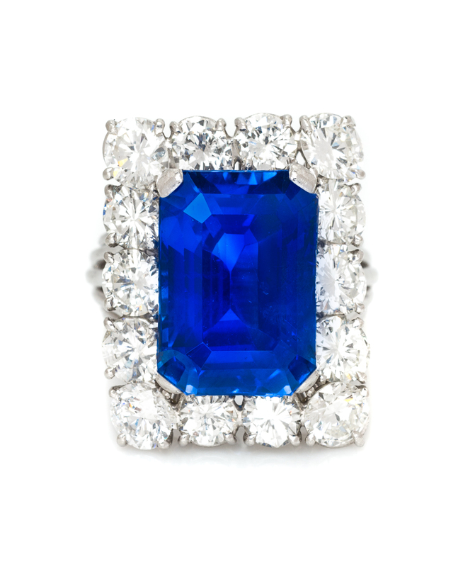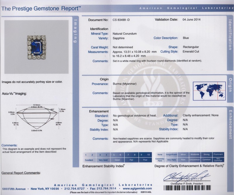 containing one octagonal step cut weighing approximately 12.38 carats with 14 round transitional brilliant cut diamonds weigihng approximately 3.70 carats total.Accompanied by an American Gemological Laboratories sapphire identification and origin certificate number CS 83499-D, dated June 4, 2014, stating Mineral Type: Natural Corundum, Variety: Sapphire, Origin: Burma (Myanmar), Enhancement: No gemological evidence of heat, Clarity Enhancement: None.
