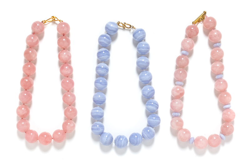 consisting of a necklace containing 19 blue lace agate beads measuring approximately 21.19 mm in diameter strung knotted with a gold tone clasp, a necklace containing 19 rose quartz beads measuring approximately 19.50 mm in diameter strung knotted with a gold tone clasp, together with a necklace containing 18 rose quartz beads measuring approximately 19.50 mm in diameter and eight blue lace agate beads measuring approximately 12.20 mm in diameter and strung knotted with a gold tone clasp.