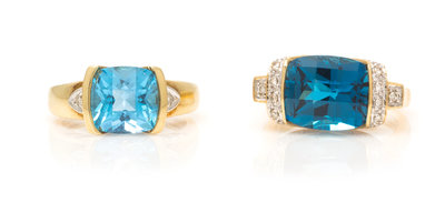 consisting of a ring containing one cushion shape checkerboard cut blue topaz measuring approximately 11.65 x 9.95 x 7.35 mm and 24 round brilliant cut diamonds weighing approximately 0.24 carat total together with a ring containing one cushion shape checkerboard cut aquamarine measuring approximately 9.00 x 9.00 x 6.07 mm and two round single cut diamonds weighing approximately 0.02 carats total.