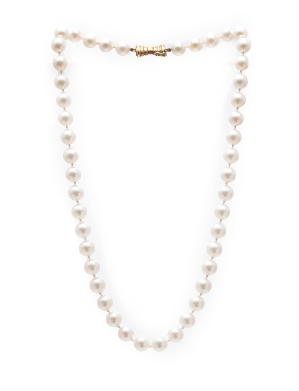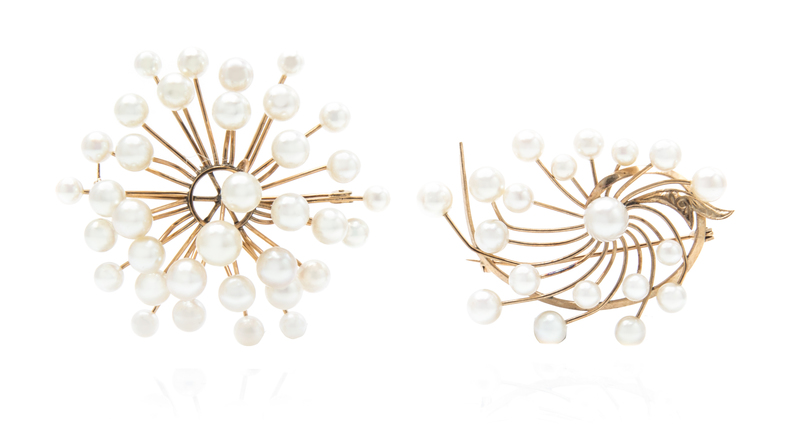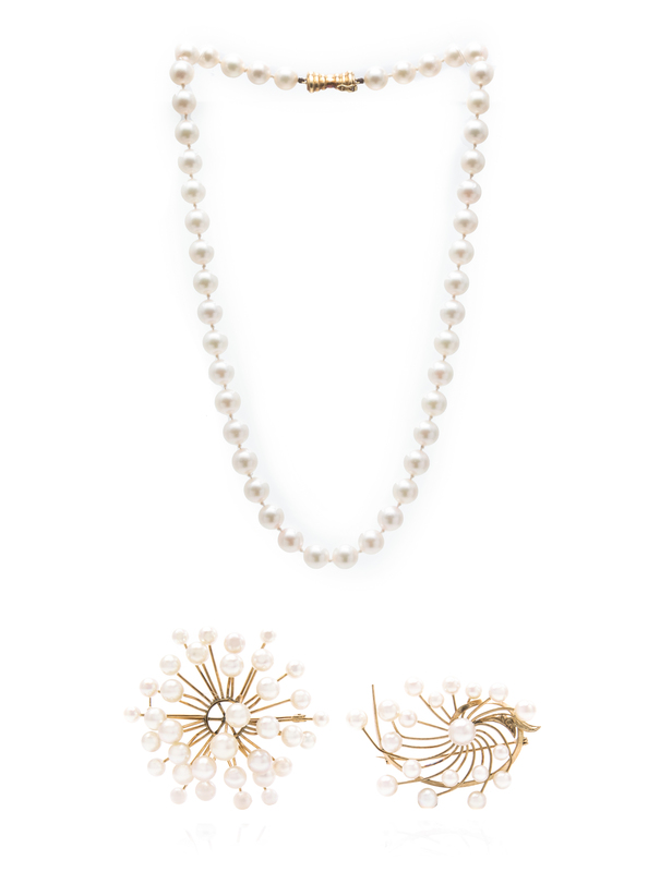 consisting of a necklace containing 46 white round cultured pearls measuring approximately 8.50-9.00 mm, a brooch containing numerous round white cultured pearls measuring approximately 3.90-6.80 mm together with a brooch containing 19 round white cultured pearls measuring between 4.50-7.40 mm.Stamp: 585 EJ.Stamp: 14K.Stamp: K14.