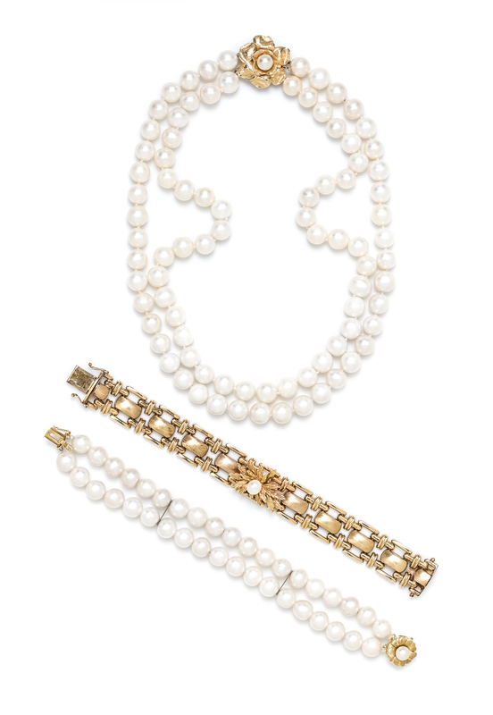 consisting of one double strand pearl necklace containing 42 round pearls measuring approximately 9.60 mm in diameter strung knotted with a yellow gold floral motif clasp, double strand pearl bracelet containing 38 pearls measuring approximately 9.00 mm in diameter strung with a yellow gold floral motif clasp, together with a 14 karat yellow gold link bracelet with a cultured pearl and foliate motif detail.