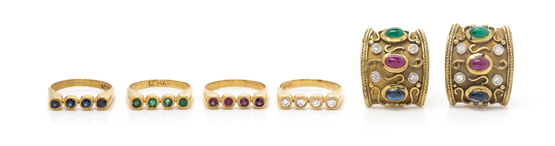 consisting of a pair of earclips containing eight round brilliant cut diamonds weighing approximately 0.24 carat total, two oval cabochon cut emeralds weighing approximately 0.84 carat total, two oval cabochon cut rubies weighing approximately 1.26 carats total and two oval cabochon cut sapphires weighing approximately 1.06 carats total, one ring containing four round brilliant cut diamonds weighing approximately 0.24 carat total, one ring containing four round mixed cut emeralds measuring approximately 2.58 mm in diameter, one ring containing four round mixed cut sapphires measuring approximately 2.58 mm in diameter, and one ring containing four round mixed cut rubies measuring approximately 2.58 mm.