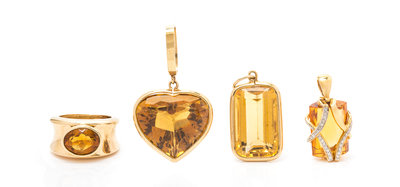 consisting of an 18 karat yellow gold pendant containing one cylindrical step cut citrine measuring approximately 16.63 x 11.89 x 6.90 mm and 28 round brilliant cut diamonds, a yellow gold pendant containing one heart shape mixed cut citrine measuring approximately 20.40 x 23.61 x 12.72 mm, a yellow gold pendant containing one octagonal step cut citrine measuring approximately 22.14 x 14.00 x 10.28 mm together with a 14 karat yellow gold ring containing one oval shape mixed cut citrine.Stamp: 750 BADI.Stamp: 14 KT.