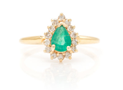 containing one pear shaped emerald measuring approximately 6.79 x 4.81 x 3.46 mm and 14 round brilliant cut diamonds weighing approximately 0.21 carat total.Stamp: 14K.