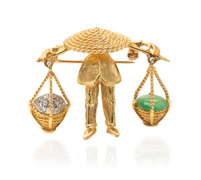 A 14 Karat Yellow Gold, Jade and Diamond Figural Brooch,