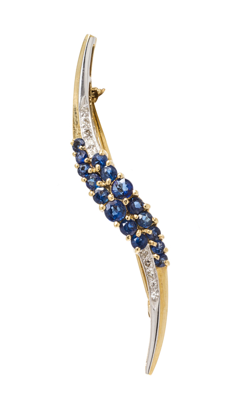 A 14 Karat Yellow Gold, Sapphire and Diamond Brooch,