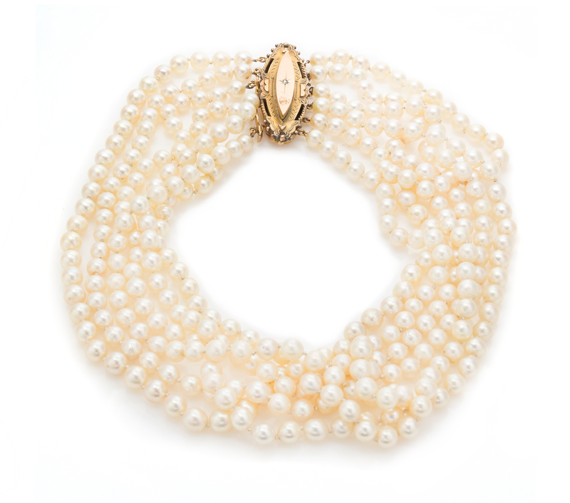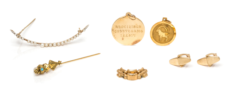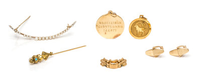 consisting of a 14 karat gold circle pendant charm, an 18 karat gold Aries circle pendant charm, a pair of 14 karat gold partial cufflinks, a 14 karat gold stickpin of a figure wearing a turban and containing one cultured pearl and one round cabochon cut turquoise, a yellow gold crescent brooch containing numerous pearls (origin not tested), a 14 karat yellow gold, diamond and multistrand cultured pearl necklace consisting of six strands containing numerous pearls measuring approximately 5.80-6.26 mm in diameter strung knotted with a 14 karat yellow gold clasp containing one rose cut diamond, together with a section of gold links.