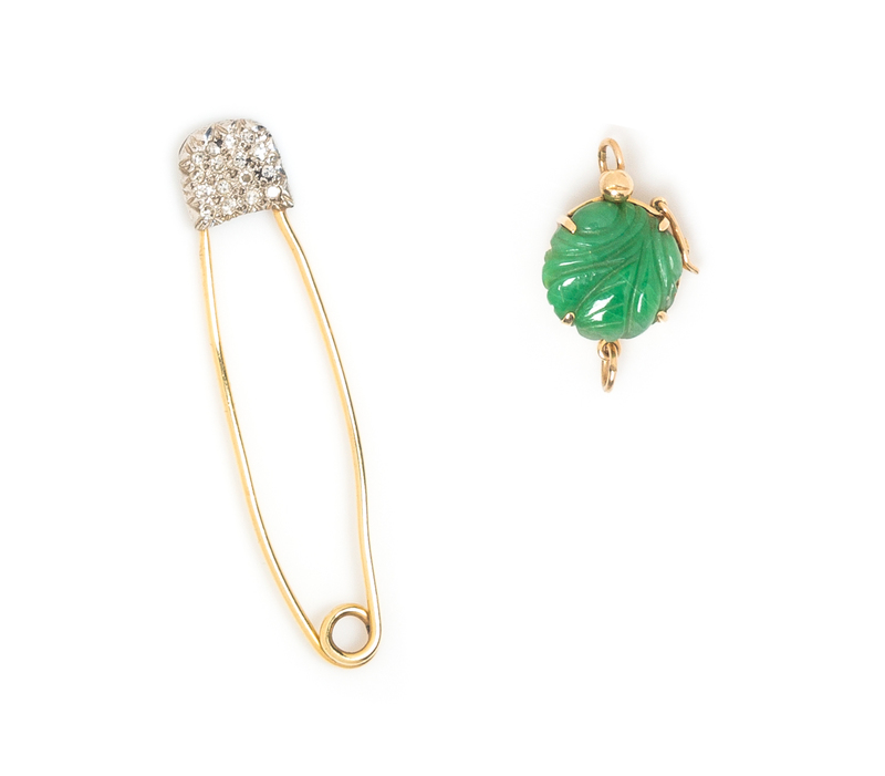 consisting of a bicolor gold safety pin containing 16 round single cut diamonds weighing approximately 0.24 carat total together with a 14 karat yellow gold clasp containing one leaf motif carved jade plaque.Stamp: 14K.