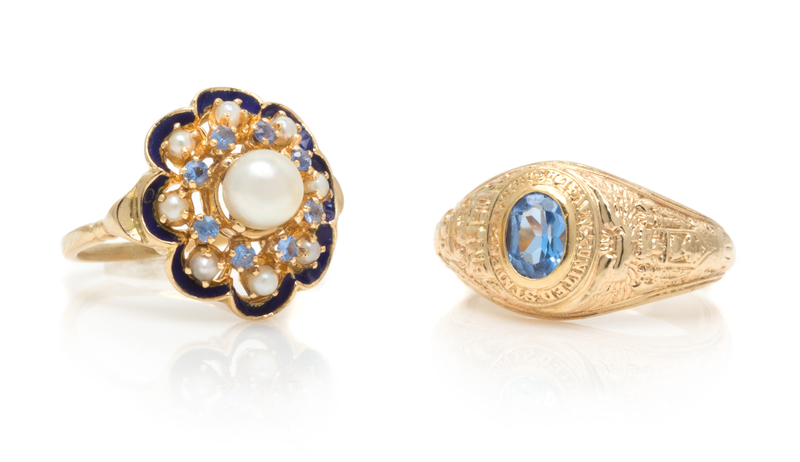 consisting of a ring containing one cultured pearl measuring approximately 6.31 mm in diameter, eight blue spinel measuring approximately 2.18 mm in diameter, eight seed pearls measuring approximately 2.05 mm in diameter and blue enamel accents, together with a class ring containing one oval mixed cut blue stone measuring approximately 7.15 x 5.08 mm.