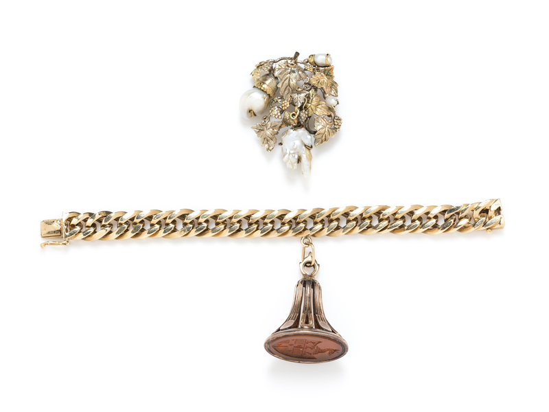consisting of a double oval link bracelet together with a fob pendant containing a carnelian carved British heraldic motif intaglio/seal, together with a 12 karat yellow gold and freshwater baroque pearl pendant/brooch, consisting of applied grape and leaf motifs, containing four baroque pearls (origin not tested). Stamp: 12K.Stamp: 14K.