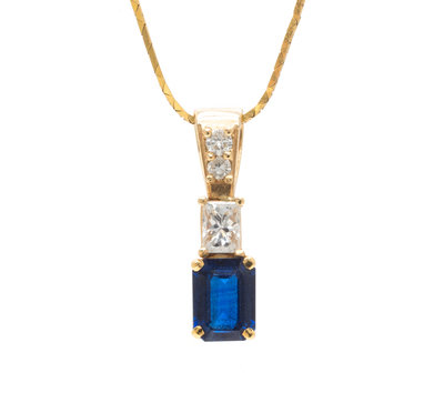 containing one octagonal step cut sapphire, one rectangular princess cut diamond, and two round brilliant cut diamonds, suspended from a 14 karat yellow gold chain.