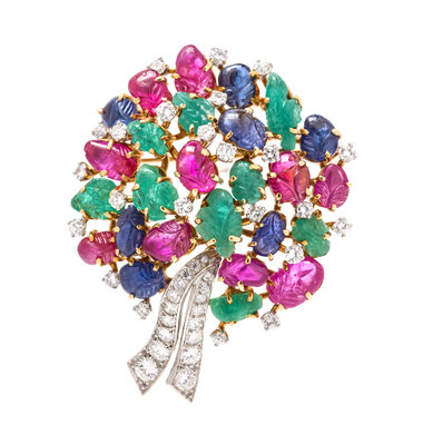 in an open wirework gold cluster setting with platinum ribbon motif accents, the brooch containing numerous carved rubies, emeralds and sapphires in a leaf motif and numerous round brilliant cut diamonds weighing approximately 1.50 carats total.