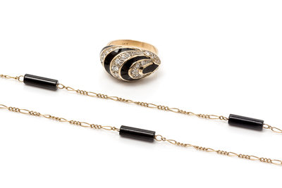 consisting of a necklace containing 12 barrel shaped onyx beads suspended along lengths figaro chain, together with a ring containing 35 round brilliant and single cut diamonds weighing approximately 0.62 carat total with swirls on onyx inlay.Stamp: 14K.