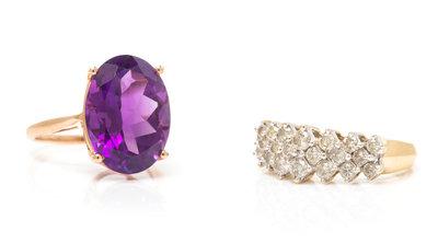 containing of a yellow gold ring containing 20 round brilliant cut diamonds weighing approximately 0.81 carat together with a rose gold ring containing one oval mixed cut amethyst measuring approximately 16.16 x 12.00 x 8.21 mm.