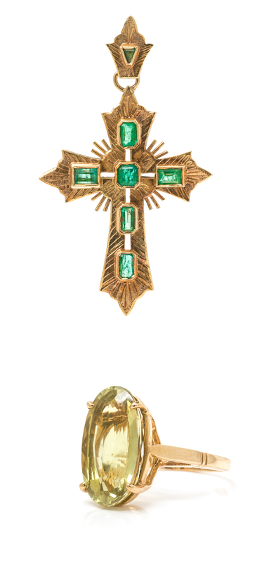 consisting of a ring set with an oval mixed cut chrysoberyl weighing approximately 11.63 carats, together with a yellow gold cross containing seven step cut emeralds of various shape and size. Ring stamp: 14K.Cross Stamp: 18k.