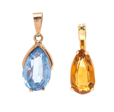 consisting of a pendant containing one pear mixed cut synthetic spinel measuring approximately 16.40 x 11.07 x 6.04 mm together with a pendant containing one pear mixed cut citrine measuring approximately 17.75 x 9.15 x 5.61 mm.