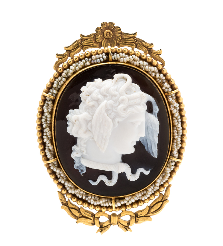 composed of an oval carved onyx cameo depicting Medusa in profile measuring approximately 35.00 x 30.00 mm, the bezel containing a twisted seed pearl rope border and intricate floral and bow motif engraving.