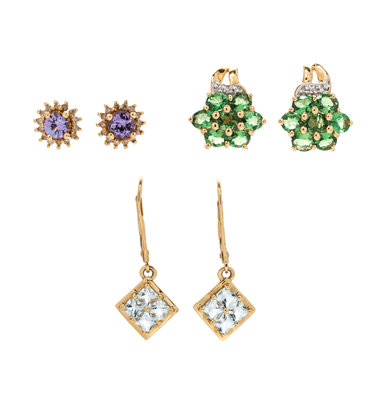 consisting of a pair of drop earrings containing eight princess cut quartz measuring approximately 3.17 x 3.17 mm, a pair of earrings containing two round mixed cut tanzanite measuring approximately 4.39 x 4.37 mm and 28 round single cut diamonds, together with a pair of earrings containing 14 oval mixed cut tsavorite measuring approximately 4.32 x 2.94 mm and six round single cut diamonds.Stamp: 14K.