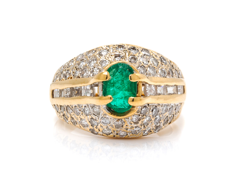 containing one oval mixed cut emerald measuring approximately 6.70 x 4.57 mm, eight baguette cut diamonds weighing approximately 0.28 carat total, and 58 round brilliant cut diamonds weighing approximately 0.58 carat total.Stamp: 14K.