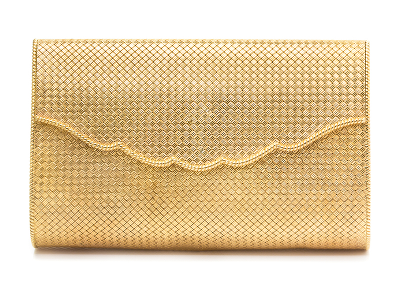 in a rigid textured basketweave design with hinged lid, the interior accented with a mirror, measuring approximately 166.00 x 103.00 x 50.00 mm.Stamp: 14K.