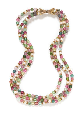 A Gilt Silver, Fluorite and Cultured Pearl Multistrand Bead Necklace,