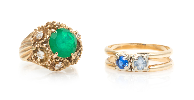 consisting of a ring containing one round mixed cut emerald and synthetic emerald doublet measuring approximately 9.01 mm in diameter and six round brilliant cut diamonds weighing approximately 0.33 carat total, together with a 14 karat gold ring containing one dark blue synthetic spinel measuring approximately 3.80 mm in diameter and one light blue synthetic spinel measuring approximately 3.80 mm in diameter.