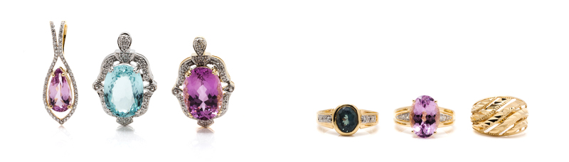 consisting of an 18 karat yellow gold pendant containing one teardrop shaped kunzite measuring approximately 14.86 x 7.81 mm and 55 round brilliant cut diamonds, an 18 karat yellow gold textured ring, a yellow gold pendant containing one oval shaped kunzite measuring approximately 18.09 X 13.10 x 9.47 mm and 26 round single cut diamonds, an 18 karat yellow gold ring containing one oval shaped kunzite measuring approximately 14.03 x 10.09 x 7.30 mm and four round brilliant cut diamonds, an 18 karat white gold pendant containing an oval shaped tourmaline measuring approximately 17.70 x 13.17 mm and 30 round single cut diamonds and an 18 karat yellow gold ring containing one oval mixed cut synthetic alexandrite measuring approximately 8.29 x 6.86 x 5.20 mm and six round brilliant cut diamonds.