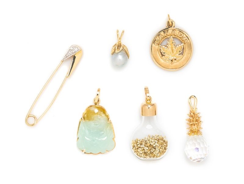 consisting of a yellow gold charm containing one mottled light green and yellow carved Buddha, a 14 karat gold CANADA maple leaf charm, a 14 karat gold and crystal briolette pineapple charm, a yellow gold charm containing one baroque cultured pearl, a 14 karat gold flat light bulb charm with encapsulated gold shavings, together with a yellow gold safety pin containing three round single cut diamonds.Stamp: 14K.Stamp: 14K (maker's mark).Stamp: 14K.