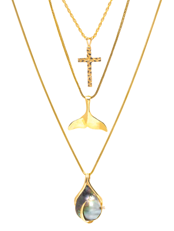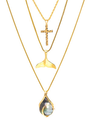 consisting of a whale tail pendant suspended from a foxtail link chain, a textured cross pendant suspended from a rope link chain, together with a slide/pendant containing one mabe pearl and one round brilliant cut diamond suspended from a snake chain.