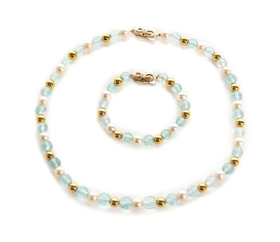 consisting of a necklace and matching bracelet containing numerous faceted aquamarine beads measuring approximately 8.20 mm in diameter, numerous goldtone beads measuring approximately 7.00 mm in diameter and numerous pearls measuring approximately 7.95 mm in diameter strung with a 14 karat gold clasp.Stamp: K14 F.