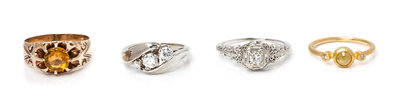 consisting of a 14 karat yellow gold ring containing one rose cut diamond (origin of color not tested) weighing approximately 0.39 carat and two round brilliant cut diamonds weighing approximately 0.03 carat total, an 18 karat gold ring containing one round brilliant cut diamond weighing approximately 0.18 carat, a rose gold ring containing a yellow doublet stone together with a 14 karat white gold ring containing three round brilliant cut diamonds weighing approximately 0.56 carat total.