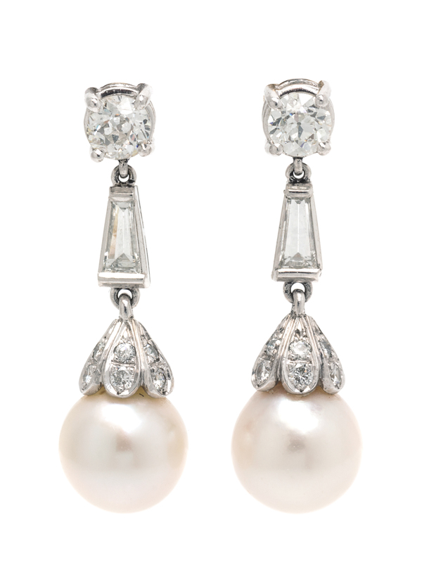 containing two old European cut diamonds weighing approximately 0.76 carat total, 12 round brilliant cut diamonds weighing approximately 0.25 carat total, two tapered baguette cut diamonds weighing approximately 0.46 carat total, and two pearls measuring approximately 9.83-9.97 mm in diameter.