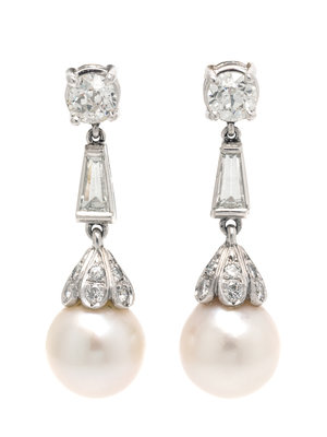 A Pair of Platinum, Diamond and Cultured Pearl Pendant Earrings,