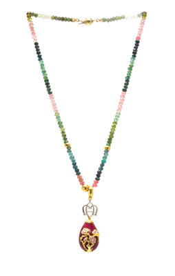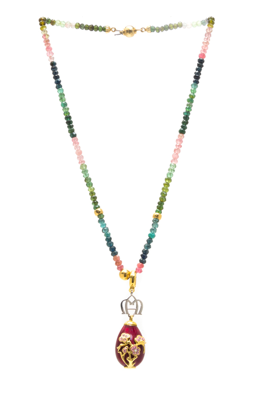 A Yellow Gold and Polychrome Enamel Egg Pendant with Multicolored Tourmaline Bead Necklace, Mozafarian,