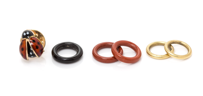 consisting of an 18 karat yellow gold and polychrome enamel ladybug pin, a pair of jasper pendant rings, one onyx pendant ring and a pair of 18 karat yellow gold pendant rings.Stamp: GERMANY 14K.Stamp: 18K.